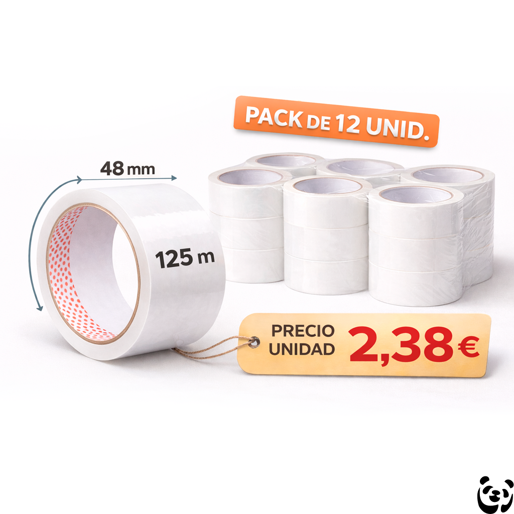 Precinto blanco de 48 mm de ancho y 125 metros de longitud, ideal para el cierre seguro de cajas de cartón en procesos de embalaje, transporte y almacenaje. Su color blanco proporciona un acabado limpio y profesional, perfecto para envíos identificados, etiquetados o con imagen corporativa.
