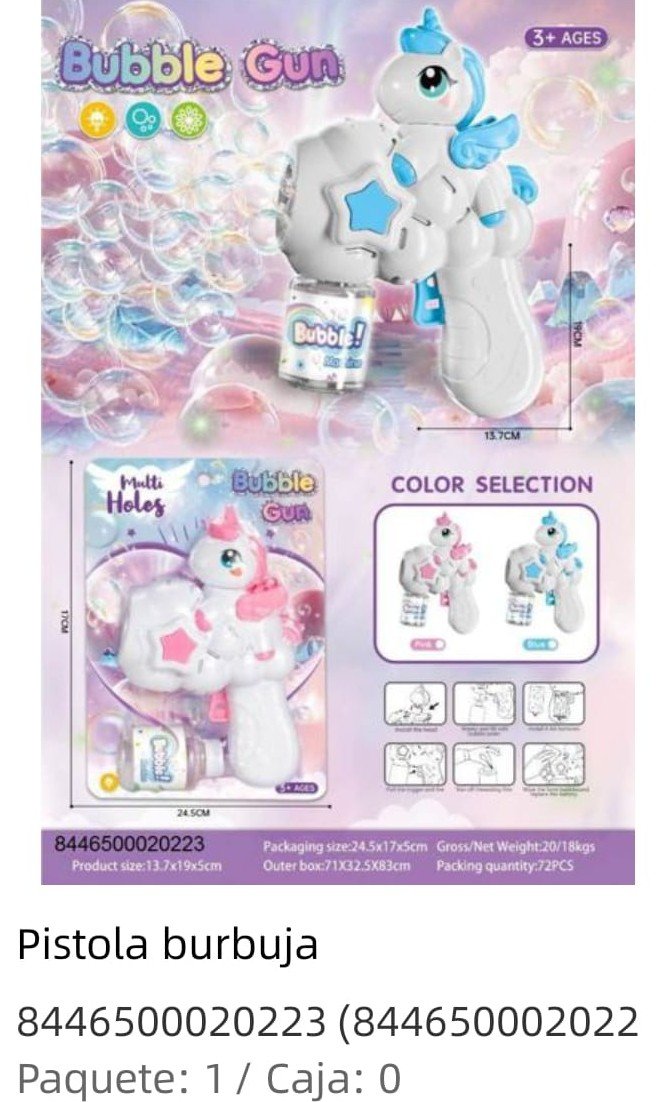 Incluye: 1 pistola + 1 o más frascos de líquido de burbujas (según presentación)