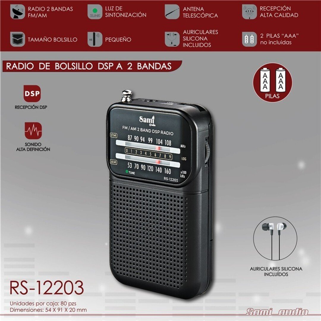 Disfruta de tus emisoras favoritas en cualquier lugar con la Radio Sami 2 Bandas Mini RS-12203.